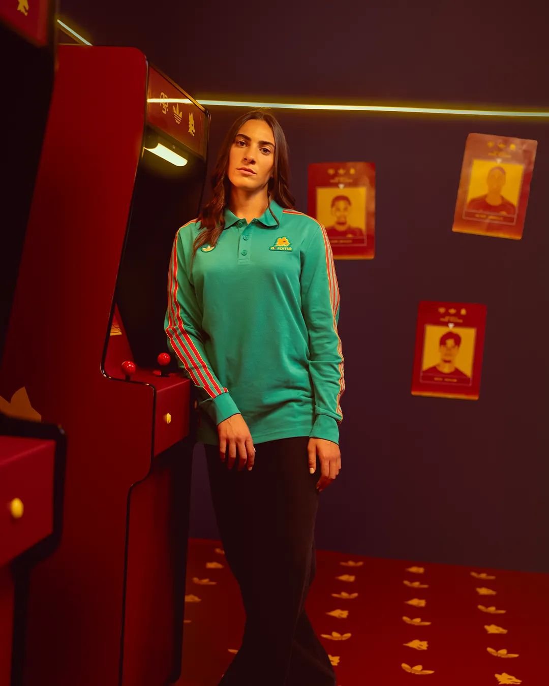 The AS Roma collection includes seven pieces inspired by classic adidas heritage. Among the highlights are a white track top and pinstriped jersey featuring Roma’s yellow and red adidas stripes, blue track pants and a graphic T-shirt displaying large Trefoil and AS Roma wordmarks, as well as a green long-sleeve polo reminiscent of early late 1980s player attire. Completing the range are a half-zip jacket and blue parka.