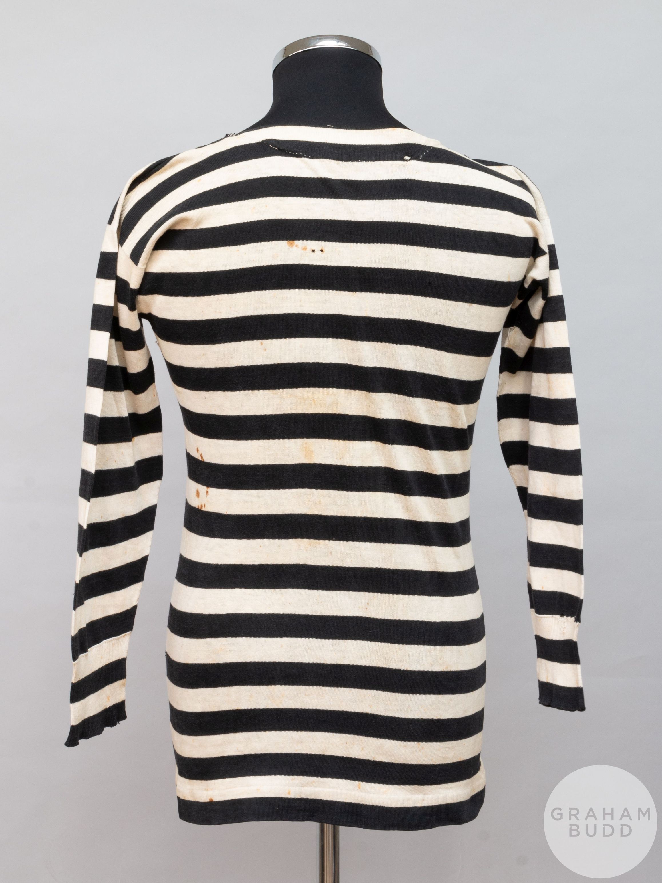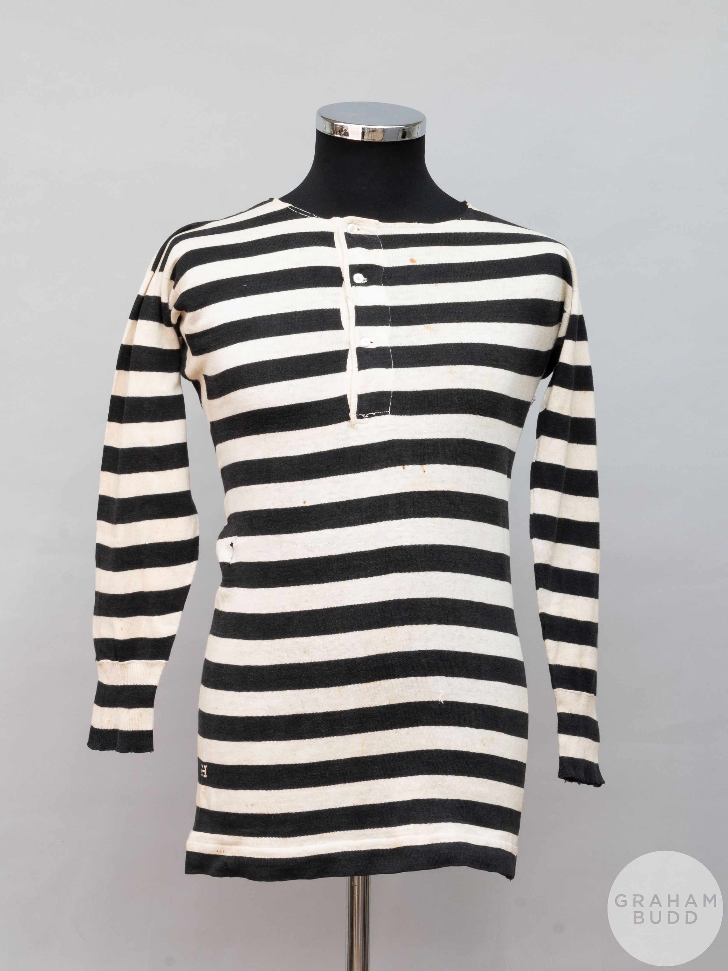 Believed to be from 1895 - making it almost 130 years old - the long-sleeved black-and-white-hooped article with an asymmetrical button-up neck is from the years before player identification through numbering but does feature a small embroidered H.