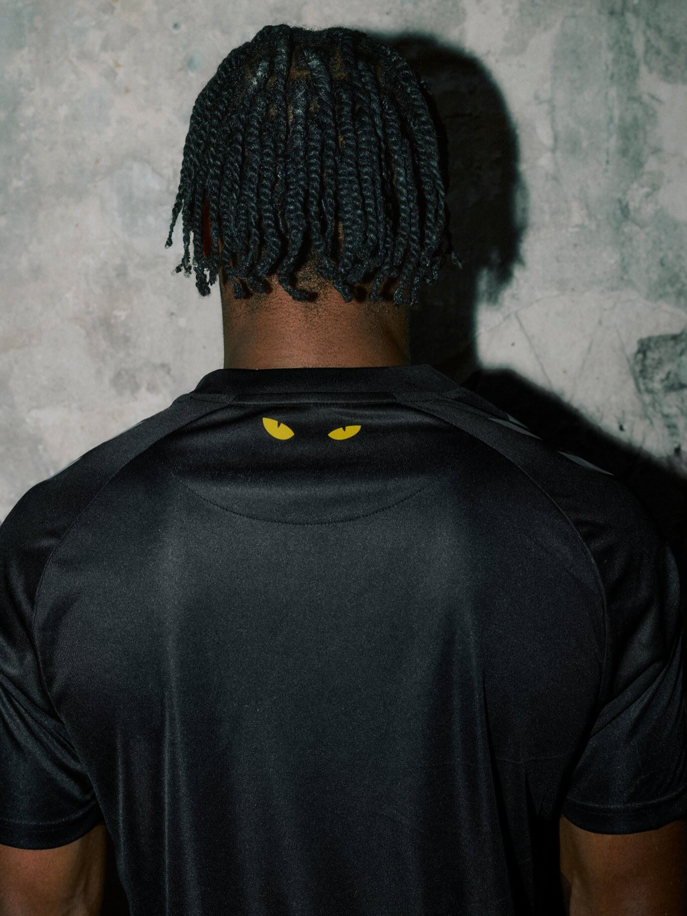 The shirt is black with a tonal pattern formed from 11 stylised black cats, representing the team on the pitch. Gunmetal grey detailing references the nickname’s origins. The front displays a black cat crest, while the back of the collar features two amber cat eyes.