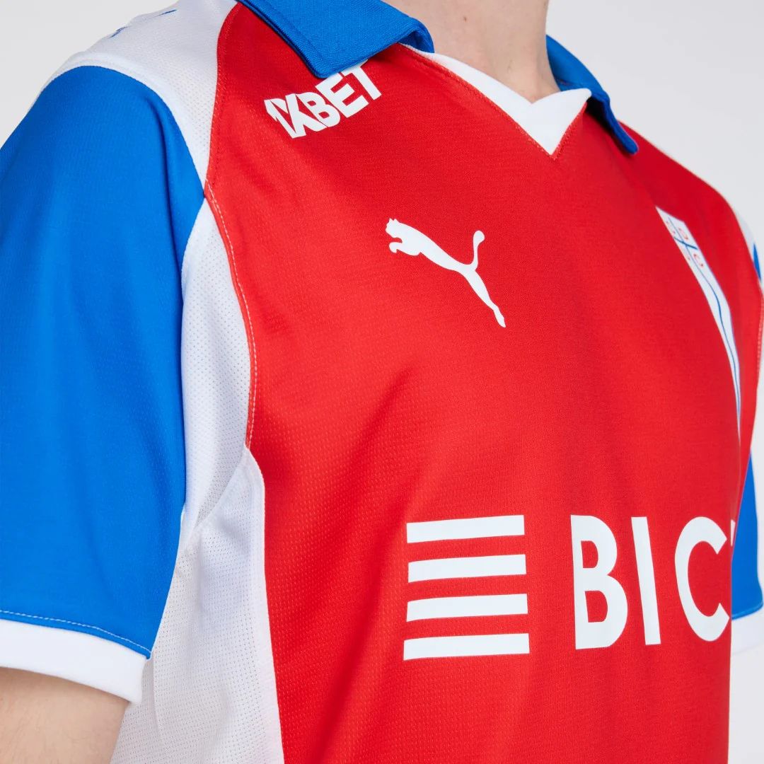The club crest is positioned on the left chest, with the Puma logo placed opposite. The BICE shirt sponsor appears centrally on the front, with additional commercial branding applied in line with competition regulations. On the reverse, a secondary sponsor is displayed beneath the collar area.