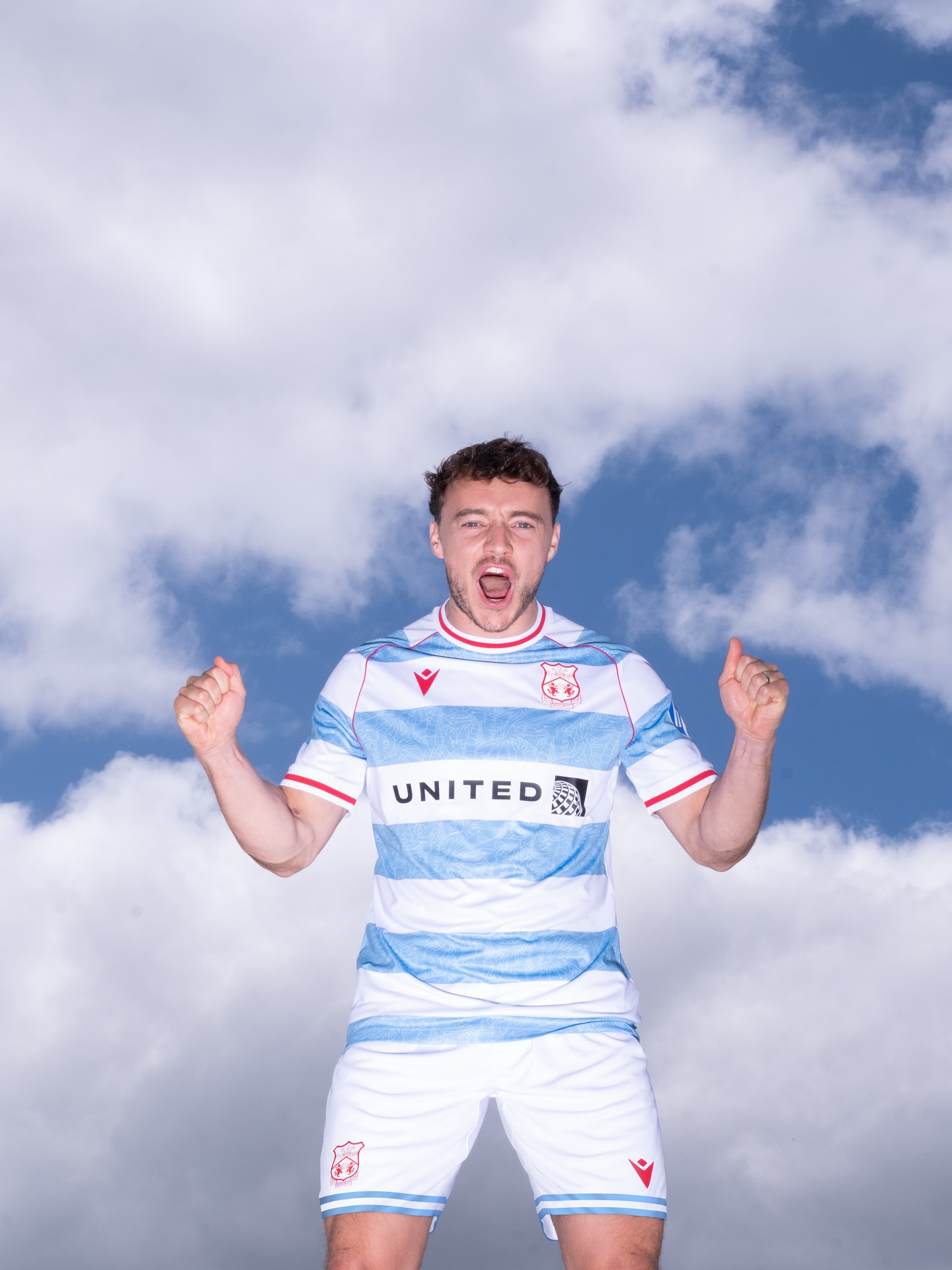 Made from Macron’s Eco Softlock fabric with micromesh inserts, the shirt offers breathable performance and sustainable construction. It is paired with white shorts featuring light blue stripes and red accents, and socks with light blue and white hoops, finished with a white top and a central red stripe.