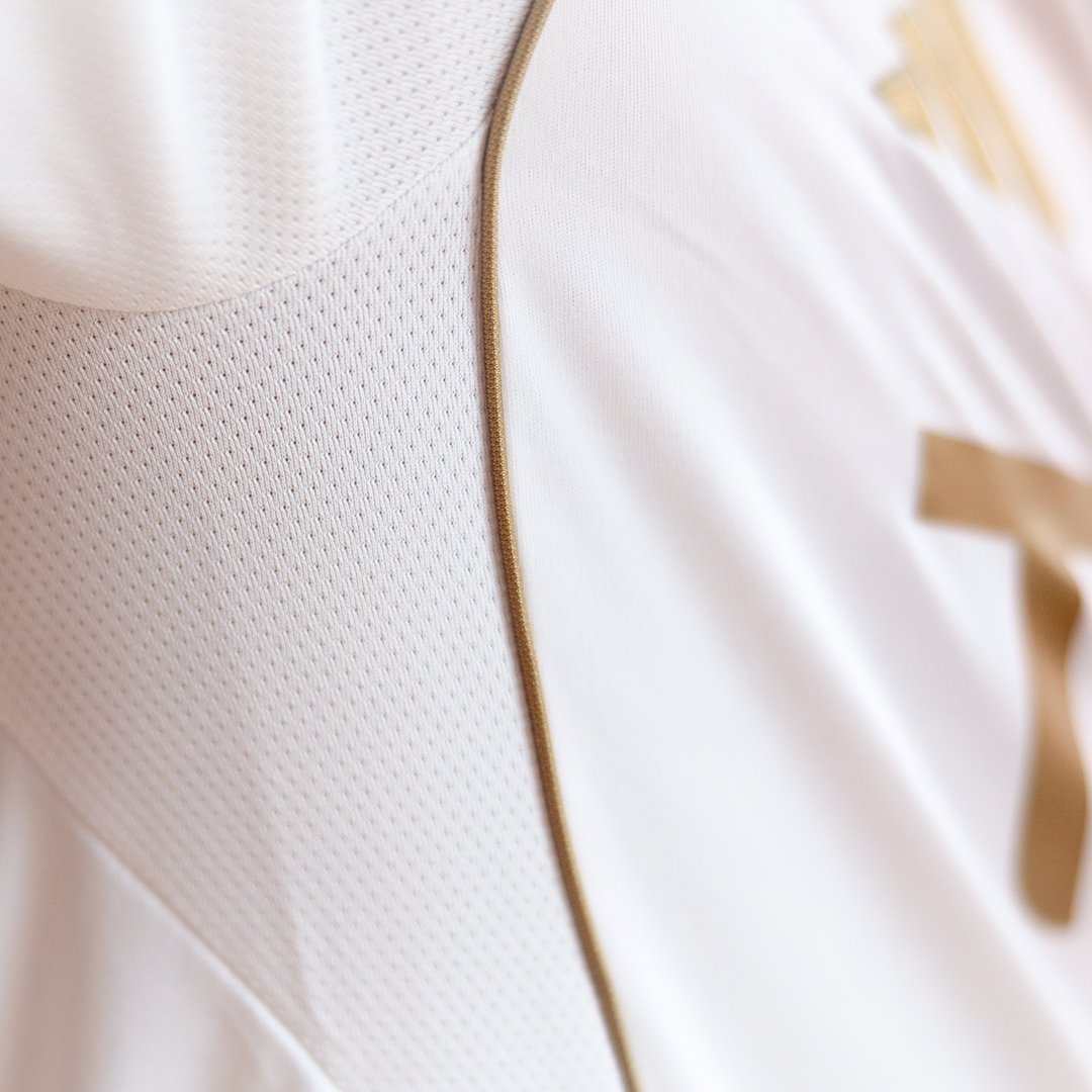 The jersey is paired with matching white shorts and socks with gold accents, and is expected to be worn during the club’s European fixtures in the upcoming season.