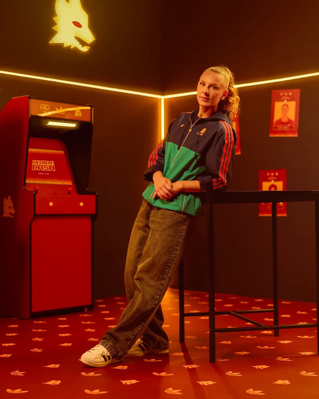 The AS Roma collection includes seven pieces inspired by classic adidas heritage. Among the highlights are a white track top and pinstriped jersey featuring Roma’s yellow and red adidas stripes, blue track pants and a graphic T-shirt displaying large Trefoil and AS Roma wordmarks, as well as a green long-sleeve polo reminiscent of early late 1980s player attire. Completing the range are a half-zip jacket and blue parka.