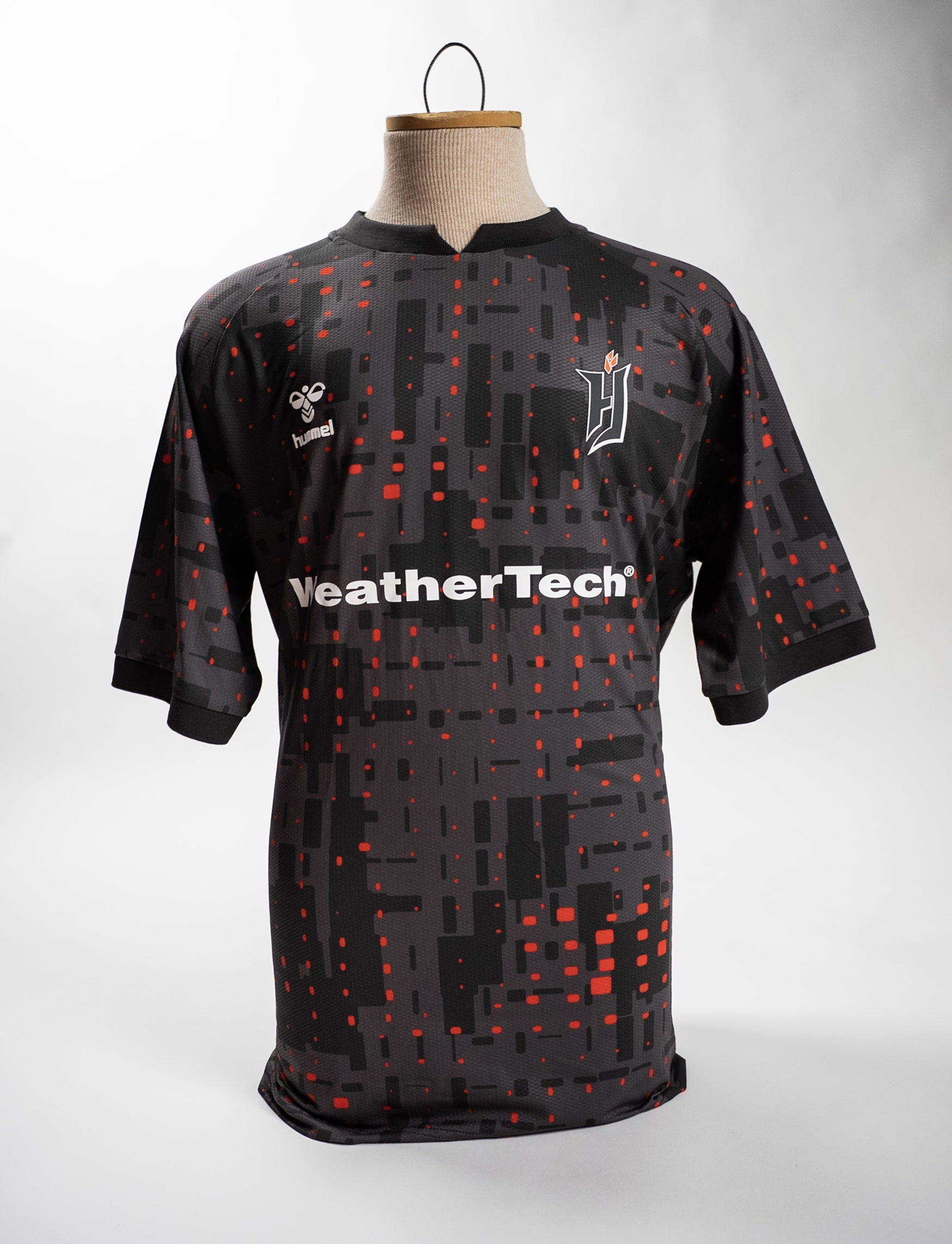 The new Forge FC jersey has a dark base with a dynamic all over tonal graphic running across the front, sleeves and lower panels, featuring fine speckled digital ember detailing.
