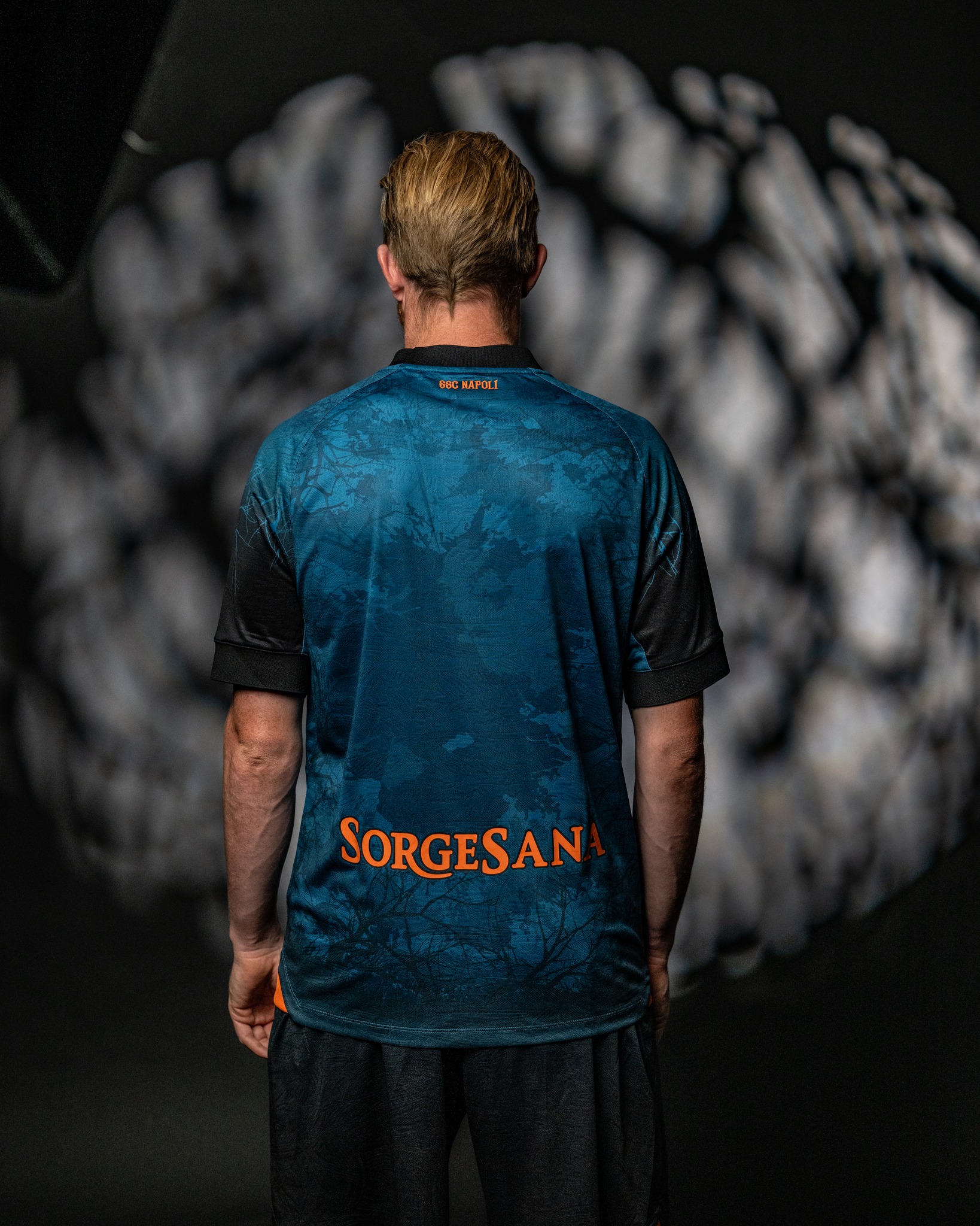 Orange accents highlight the MSC sponsor, club crest, and EA7 logo, while the Napoli emblem glows in the dark, reinforcing the shirt’s supernatural theme. A tricolour shield appears centrally on the chest, symbolising the reigning Italian champions, with black sleeves and collar adding contrast. The back carries “Sorgensana” in orange text above a continuation of the twilight forest pattern seen across the front.