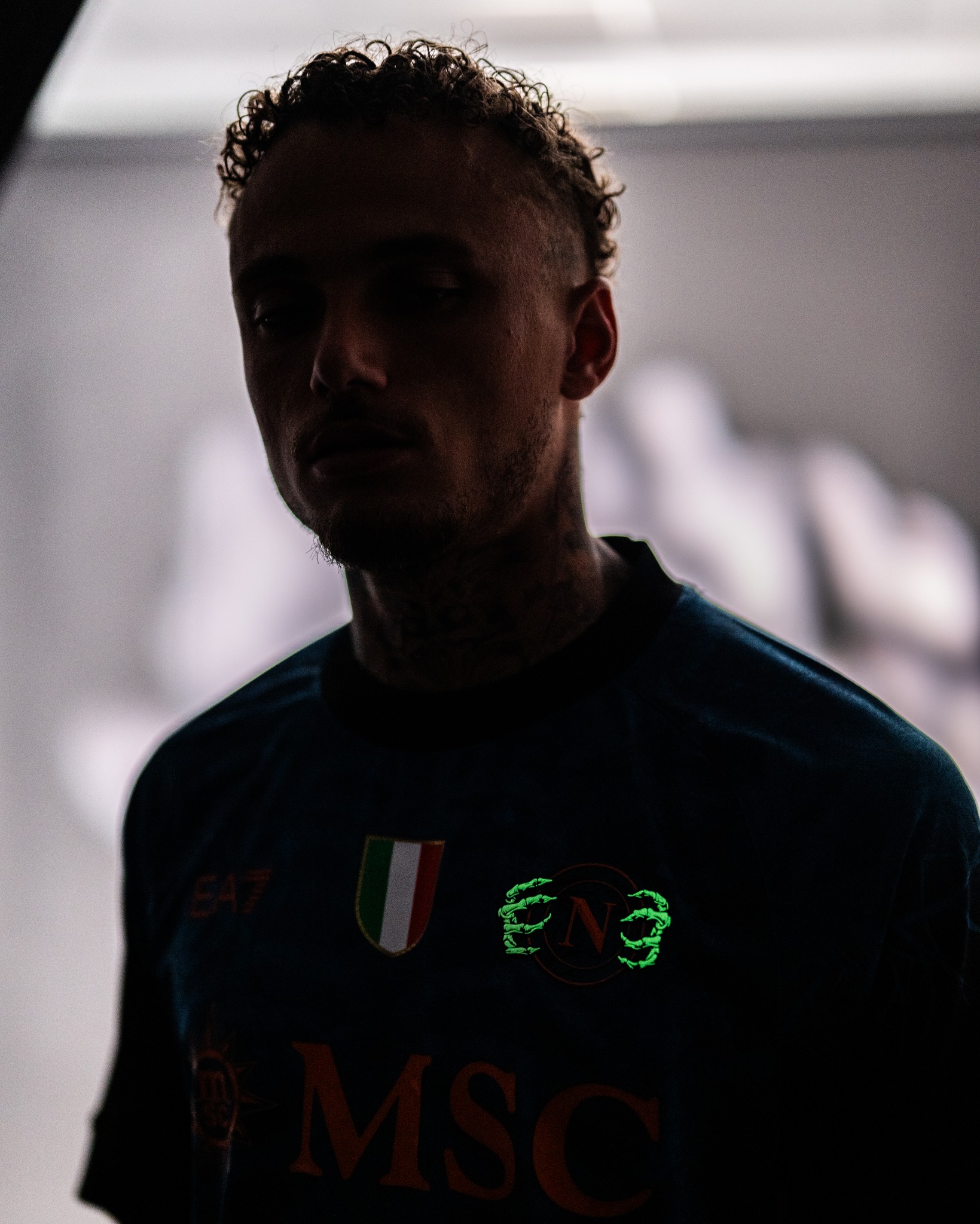 Produced as a limited edition, the Napoli 25/26 EA7 Halloween Shirt includes a bespoke font for player names and numbers and comes with a matching gymsack featuring the same crepuscular motif.
