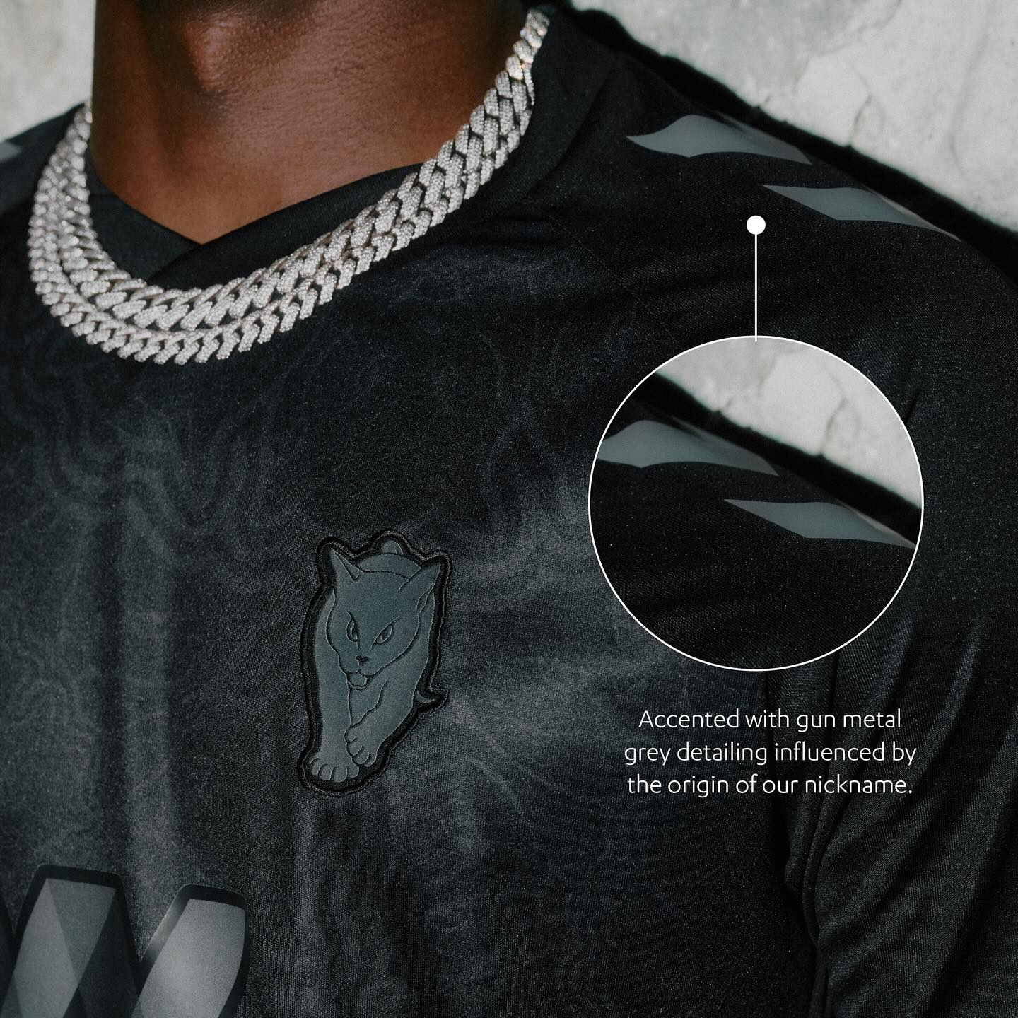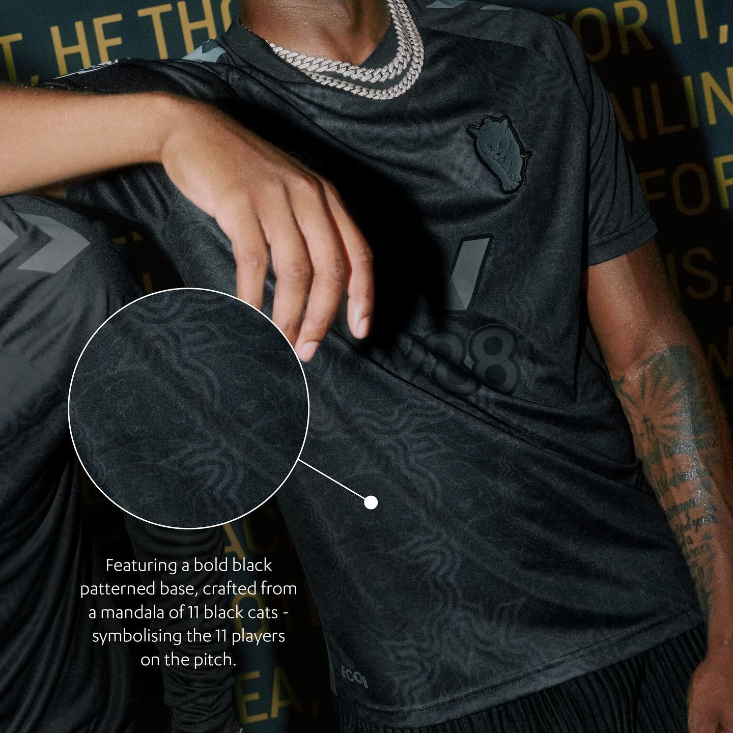 The shirt is black with a tonal pattern formed from 11 stylised black cats, representing the team on the pitch. Gunmetal grey detailing references the nickname’s origins. The front displays a black cat crest, while the back of the collar features two amber cat eyes.