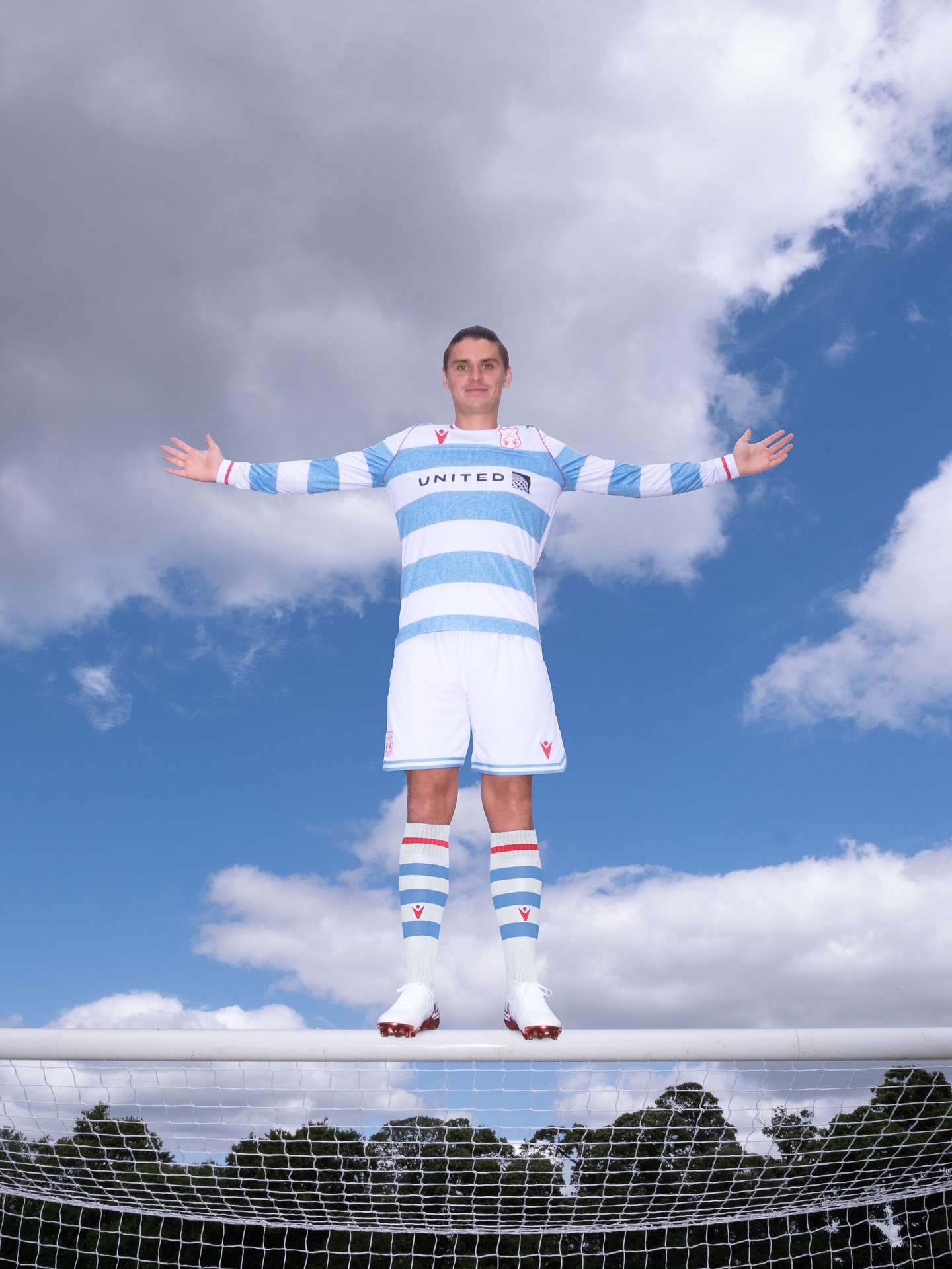 Made from Macron’s Eco Softlock fabric with micromesh inserts, the shirt offers breathable performance and sustainable construction. It is paired with white shorts featuring light blue stripes and red accents, and socks with light blue and white hoops, finished with a white top and a central red stripe.